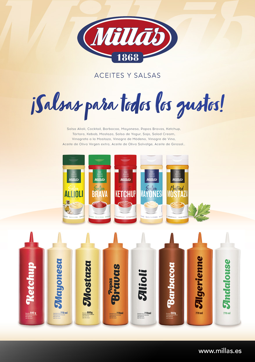 Los aliños Millás incluyen ketchup, mayonesa, mostaza, papas bravas, alioli y salsa barbacoa, envasados en biberones de alta resistencia fáciles de manejar y presionar, limpios e higiénicos en el servicio, compactos para un mejor almacenaje, e ideales para el servicio en sala.