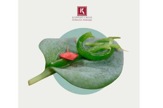 La Ostra Vegetal de Koppert Cress reinterpreta la esencia del mar con una elegancia sorprendente. Se trata de una creación vegetal que combina hoja de ostra (Oyster Leaves), Salty Fingers y Apple Blossom, tres hojas comestibles que se unen entre sí para construir una experiencia sensorial única.